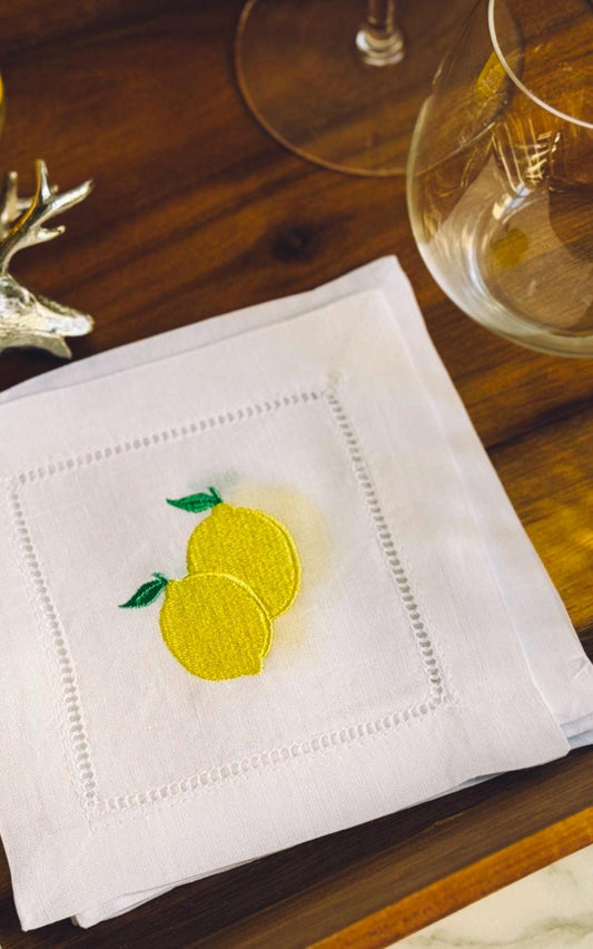Lemon Motif Embroidered Cocktail Napkins (Set of 4)